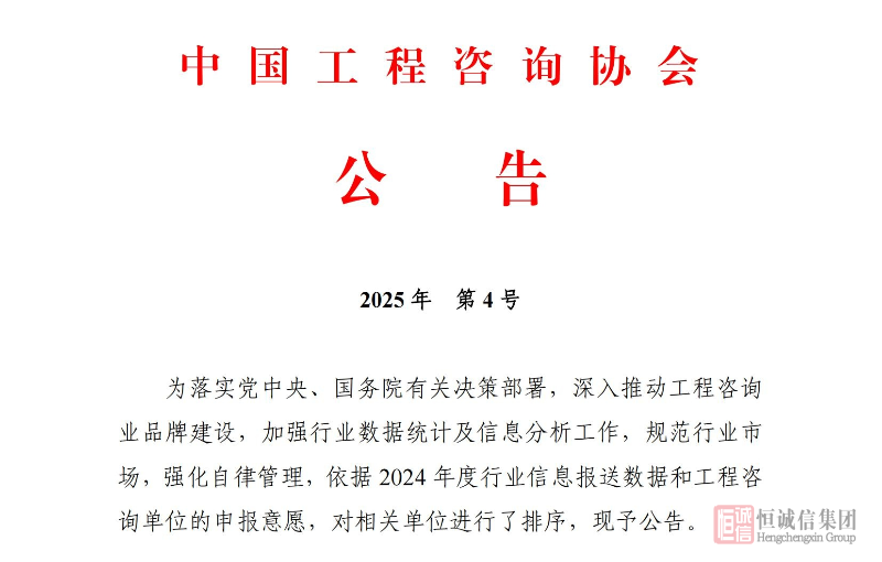 近日,中國工程咨詢(xún)協(xié)會(huì )正式發(fā)布《關(guān)于2024年度工程咨詢(xún)單位排序的公告》,恒誠信國際工程咨詢(xún)有限公司憑借出色的綜合實(shí)力與穩健的業(yè)績(jì)表現,成功上榜兩項權威排名。該排名是中國工程咨詢(xún)協(xié)會(huì )基于對全國眾多單位...